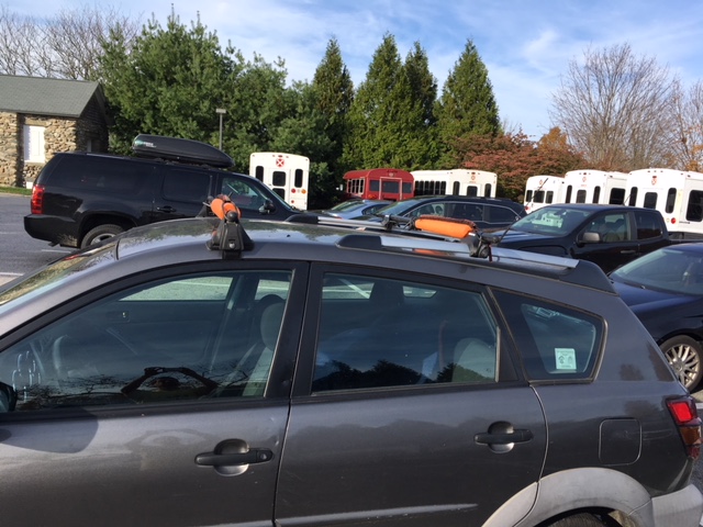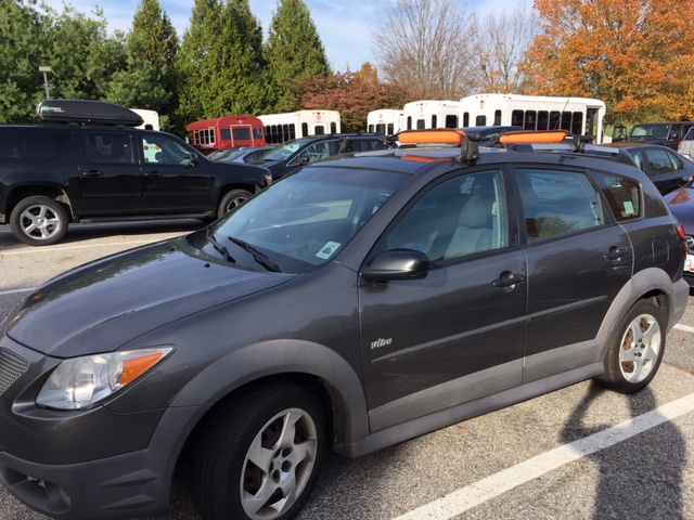 Here she is with some used racks installed today. Yakima rail grab on the back, Q-towers & Q83 clips on the front - "custom" length bars (cut down 58" to about 53). Have about 36" between the bars - same as the spacing on my Cherokee, which is awesome (the Cherokee has toted around everything from kayaks, surfboards and bikes to a harrowing 30 minute journey with a waterlogged sunfish hull during which I thought my frame was going to collapse). Front isn't quite as solid as I'd like, but it is pretty secure and I'll see how it goes. Racks will primarily be used for local non-highway surf trips (all but one board will fit inside the car for long-distance or pre-work sessions).