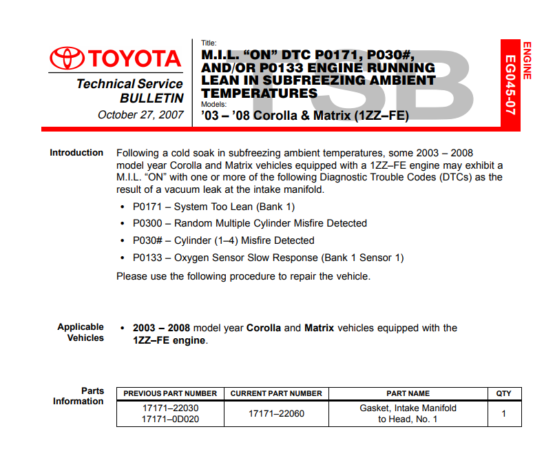 It explains the replacement procedure and gives you the part number. I've found it easier to go to the parts counter with a part number, instead of going to counter and saying I need a part for a "Matrix". There's fewer questions. There's also a link in the first post which will take you to a Toyota TSB PDF that lists a P0300 as a possible code from a bad intake gasket in cold temps. I've attached a screen shot from it.