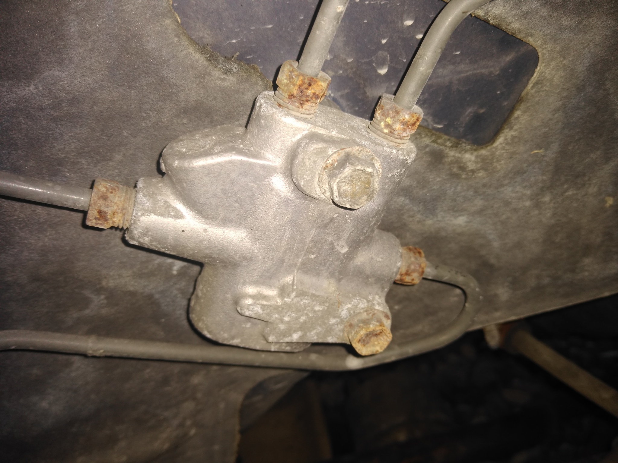 Looks like a brake proportioning valve, if not the same one, then very similar to the one shown in this ebay listing
