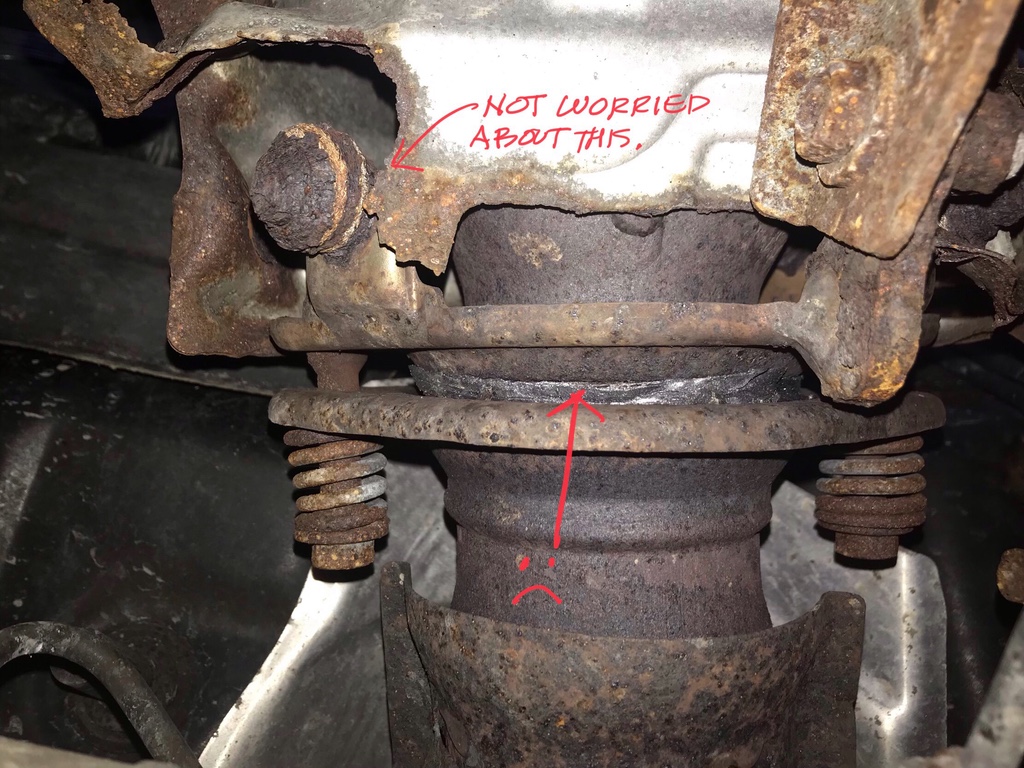 I have confirmed that the donut exhaust gasket between the manifold and the exhaust pipe is shot.